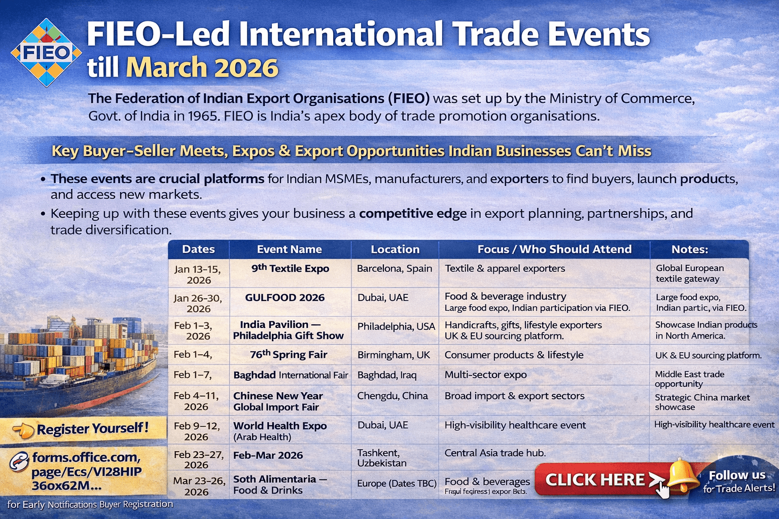 Jan 26–30, 2026 | GULFOOD 2026 | Dubai, UAE | Food & beverage industry | Large food expo, Indian participation via FIEO. |