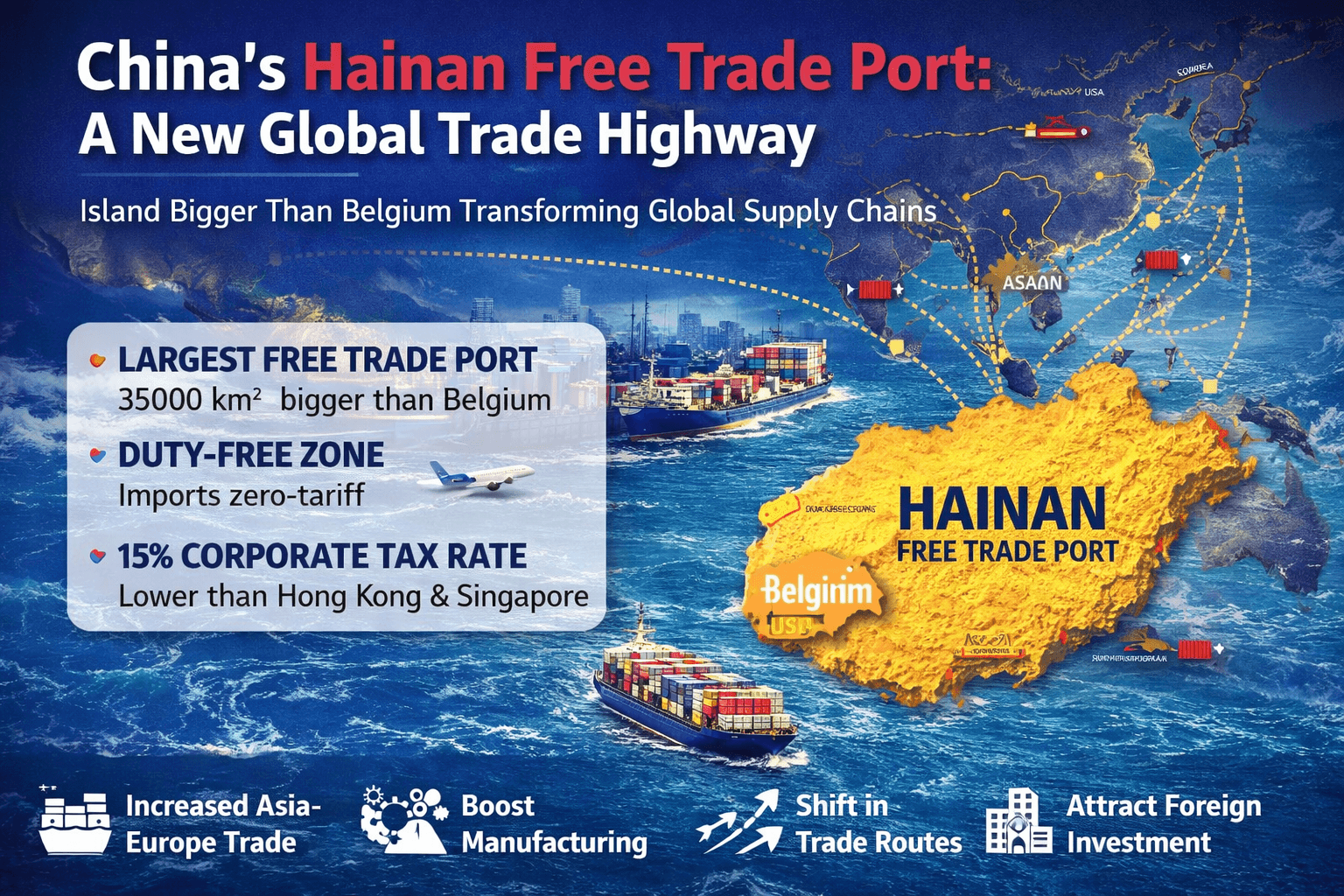 In a bold economic move that could reshape global trade flows, China has transformed its southern island province of Hainan into the world’s largest free trade port — bigger than Belgium in land area — with new laws coming into force at the end of 2025. This development is an attempt to build a mega-economic hub aimed at building a new gateway for Asian trade and supply chains.