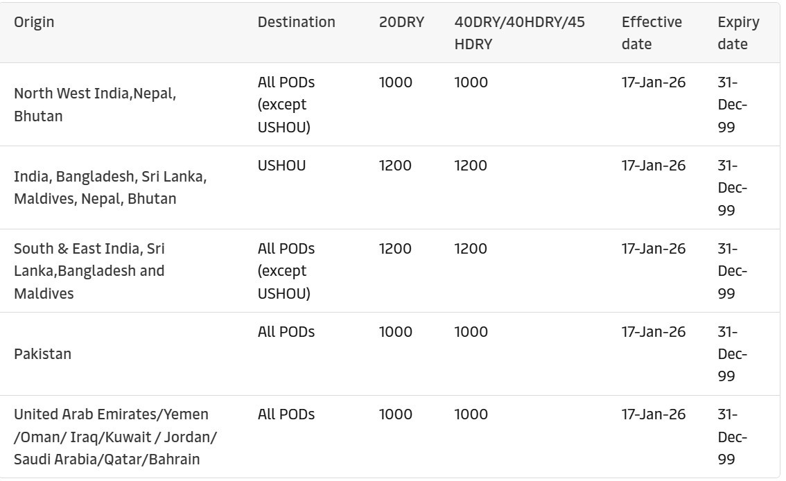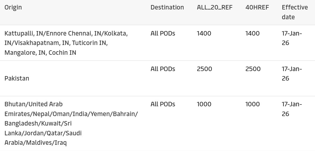 Maersk is revising the Peak Season Surcharge (PSS) for United Arab Emirates, Bangladesh, Bahrain, Bhutan, India, Iraq, Jordan, Kuwait, Sri Lanka, Maldives, Nepal, Oman, Pakistan, Qatar, Saudi Arabia, Yemen to USA and Canada East Coast effective from 17th Jan 2026 for below mentioned containers.
