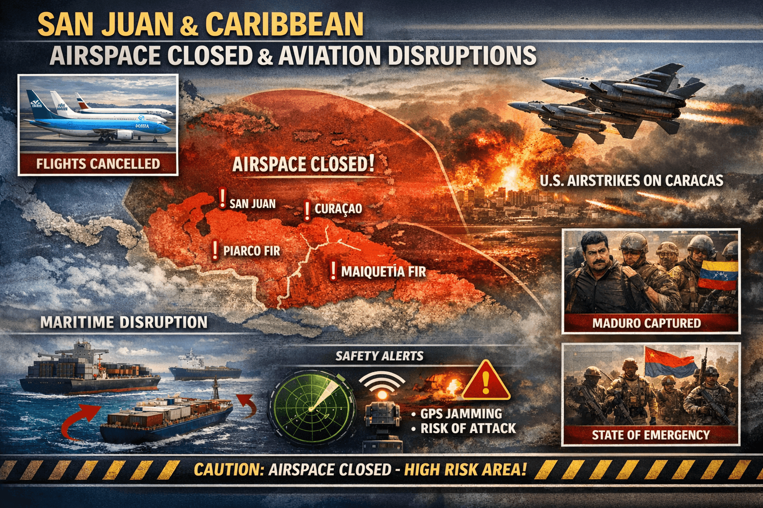 The United States Federal Aviation Administration (FAA) has issued emergency NOTAMs closing key Caribbean and Venezuelan airspaces — including San Juan (Puerto Rico), Curaçao, Trinidad’s Piarco, and Venezuela’s Maiquetía FIR — for civilian flights due to ongoing military activity and safety risks.