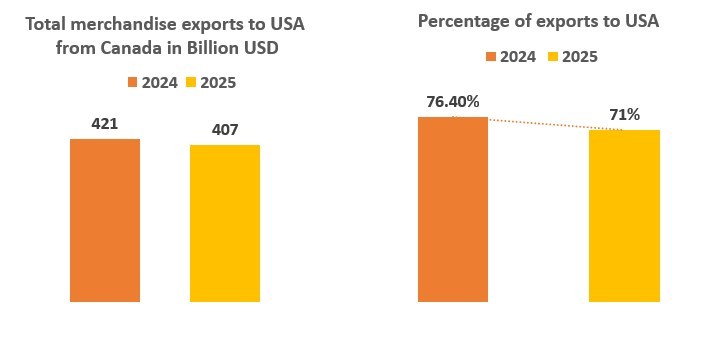 Canada is highly integrated with the U.S. economy. In 2024, roughly 76.40 % of Canadian merchandise exports was done to USA and same has reduced to 68% to 71% in 2025. Also the  exports value of cargo from Canada to USA reduced from 421 Billion USD to 407 Billion USD from 2024 to 2025 exports. This does not include the drastic reduction in profit due to tariff .