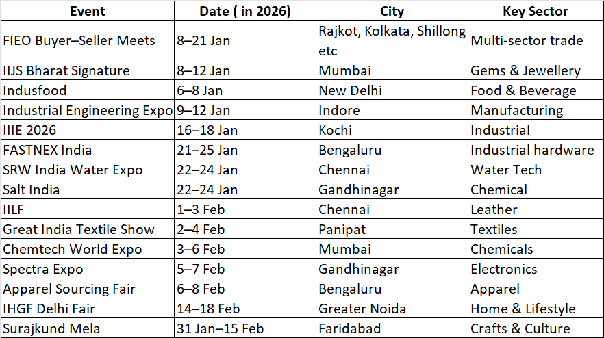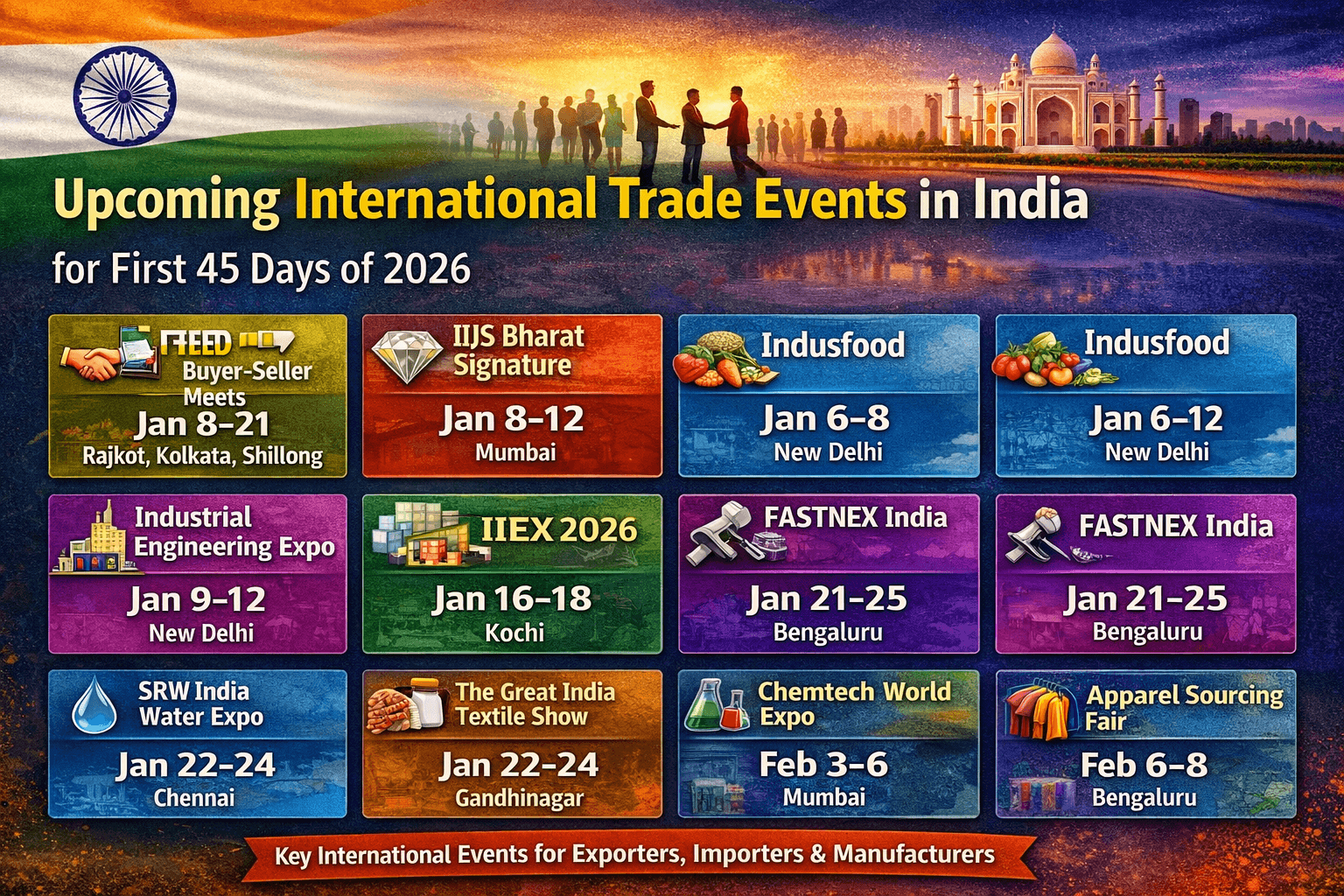 Below is the detail of international trade events planned in India relevant for exporters, importers, logistics professionals, manufacturers, MSMEs, and trade policy audiences.
